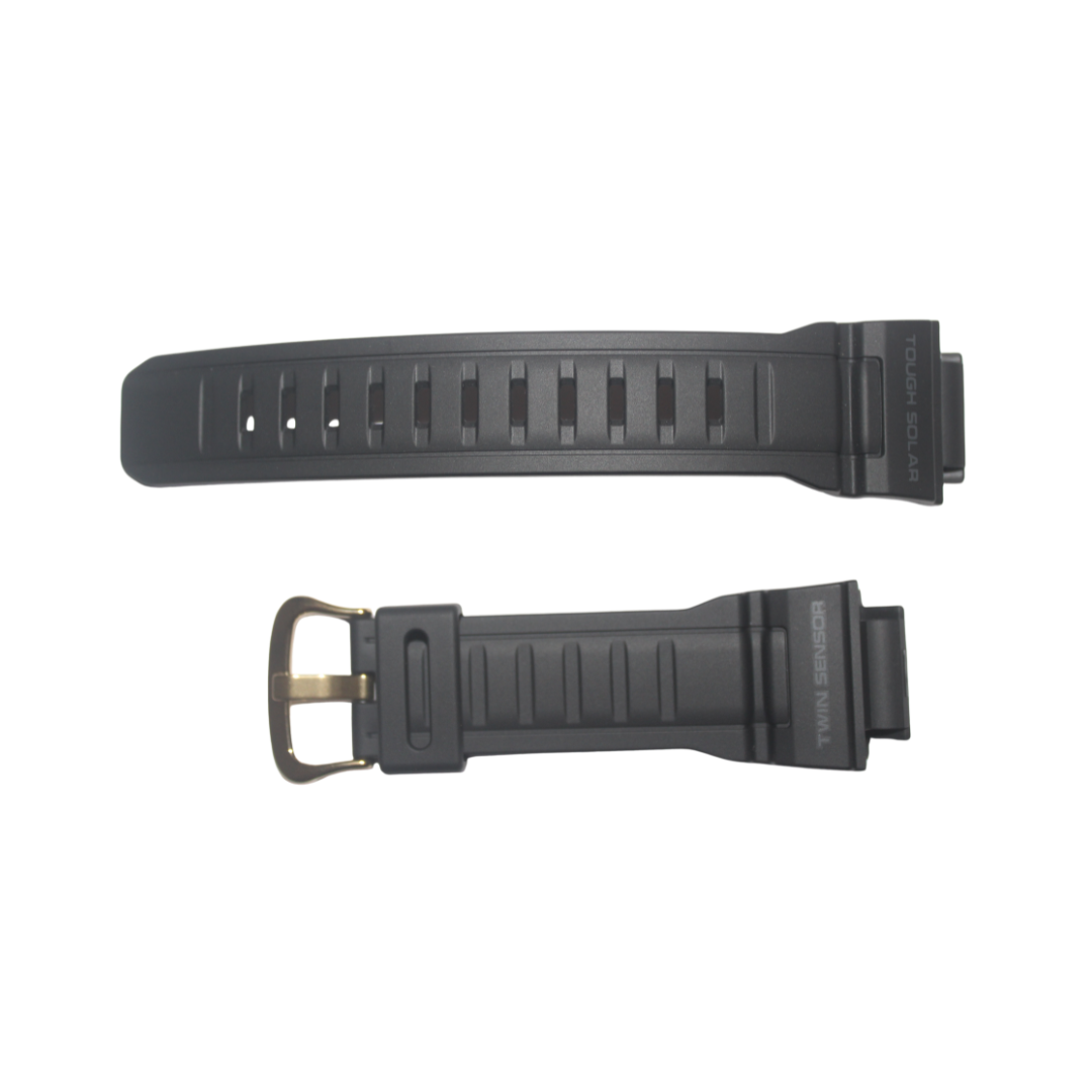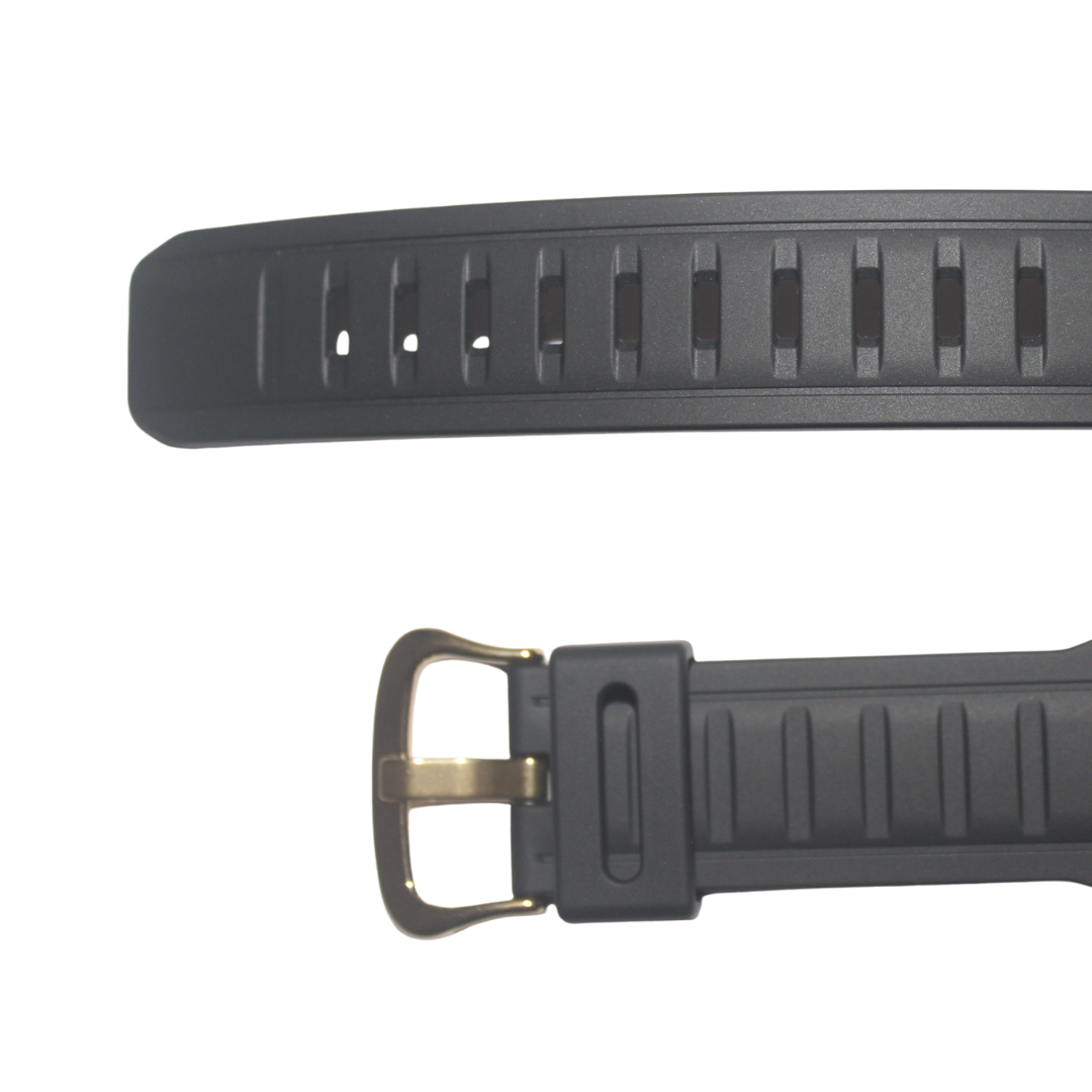 Material da pulseira e capa em borracha com escrita em todo preto, passador em borracha e com fivela em aço na cor dourada.