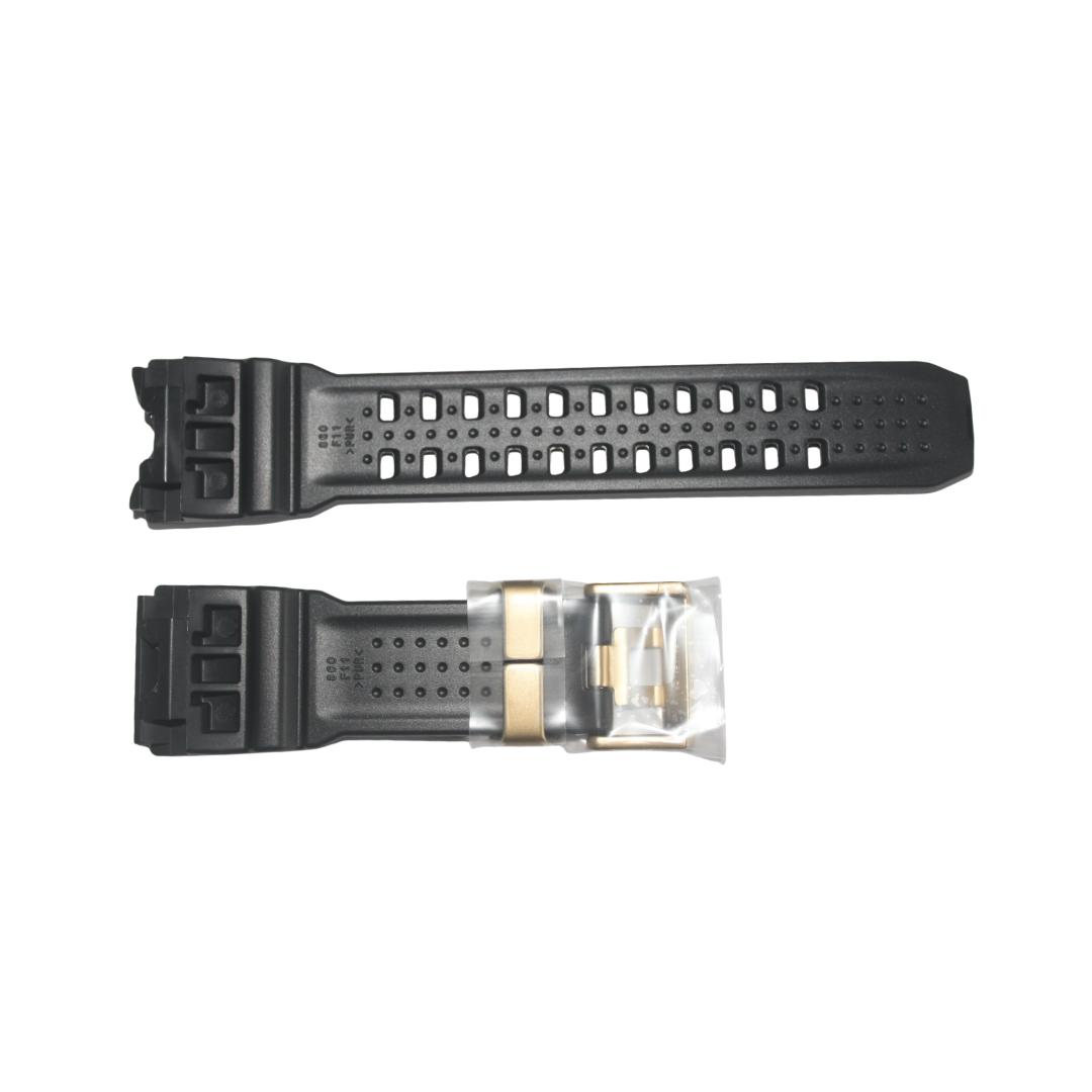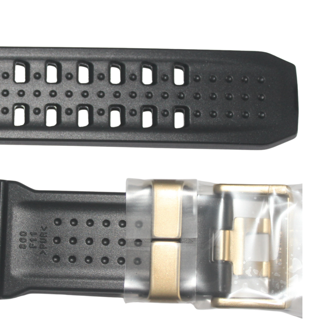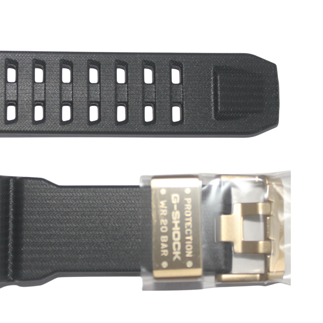 Material da pulseira borracha PRETA com passador em aço DORADO com escrita G-SHOCK e fivela em aço DOURADO.